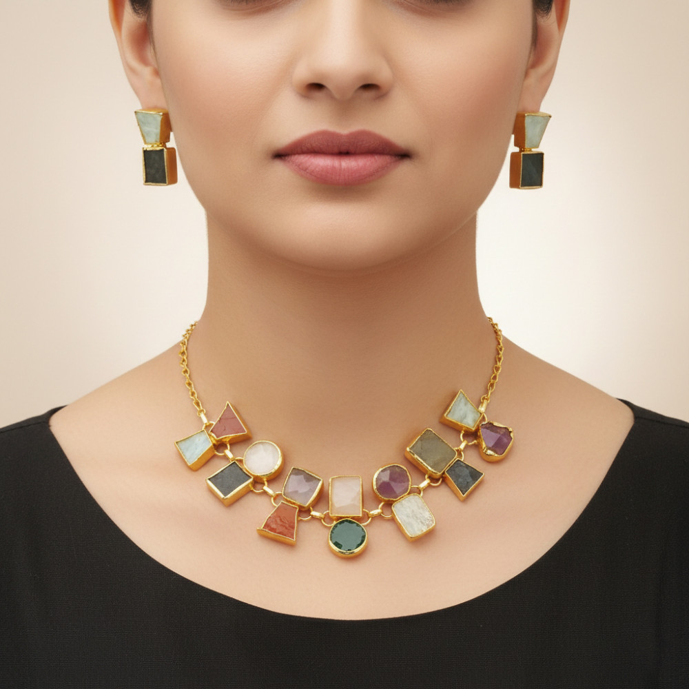 Natural Multi Raw Gemstone 18k Gold Plated Necklace Set