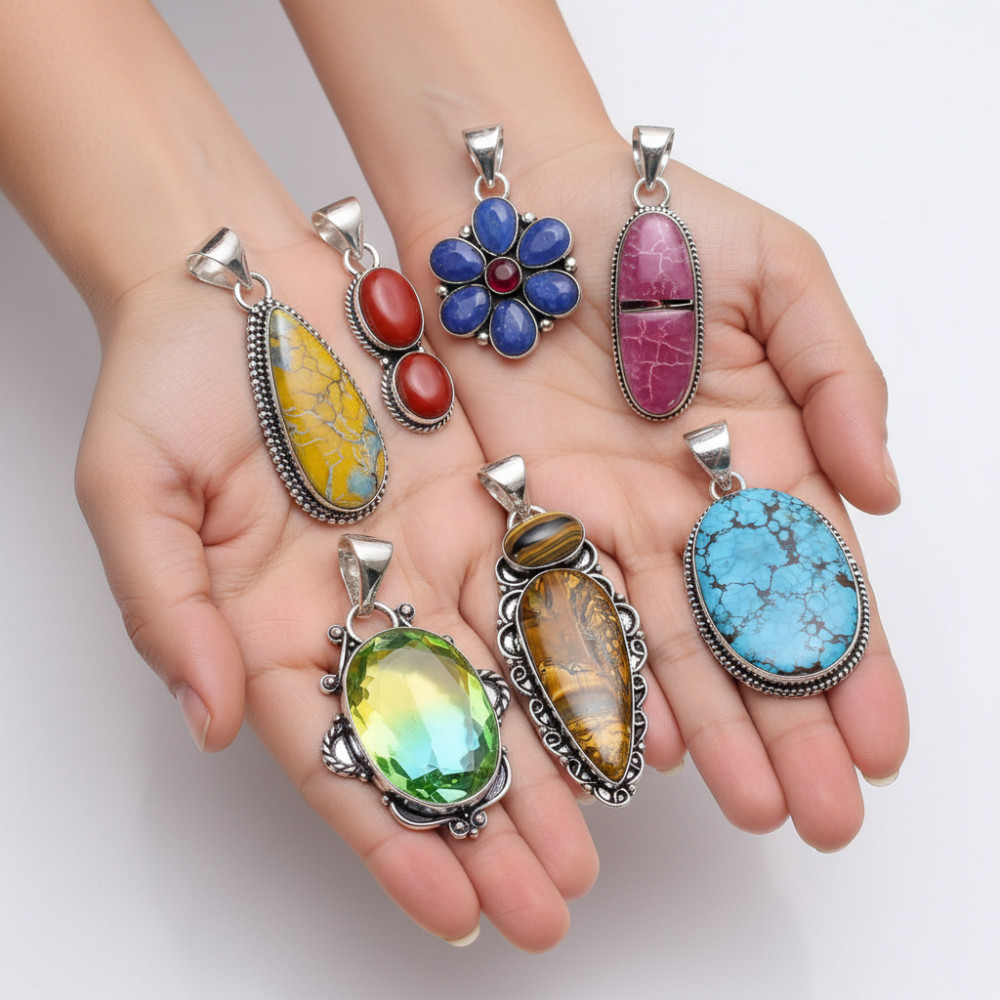 Mix Assorted Designs Gemstone Crystal Pendants 925 Silver Plated Mixed Sizes